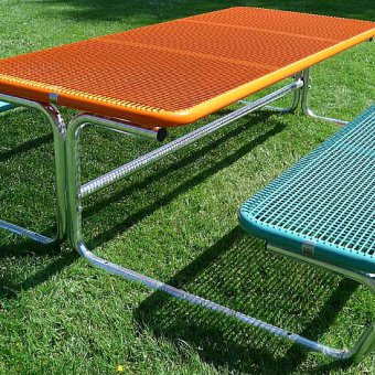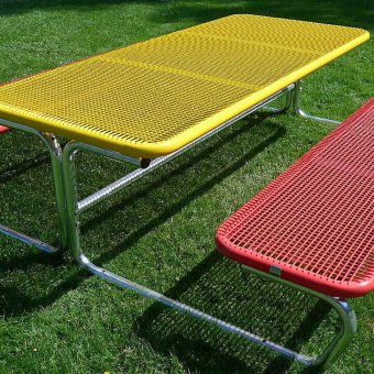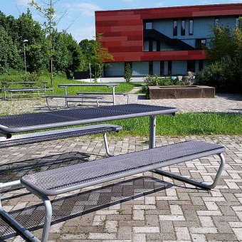 L'arredamento esterno per cortili scolastici e asili può essere combinato in modo flessibile. È possibile scegliere tra diverse combinazioni panca-tavolo:
