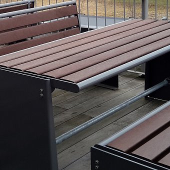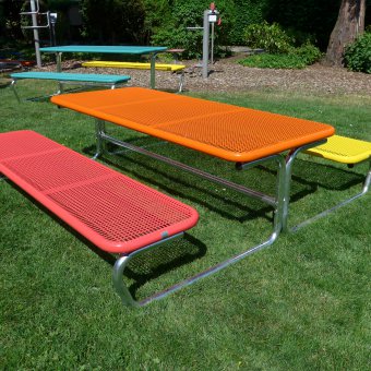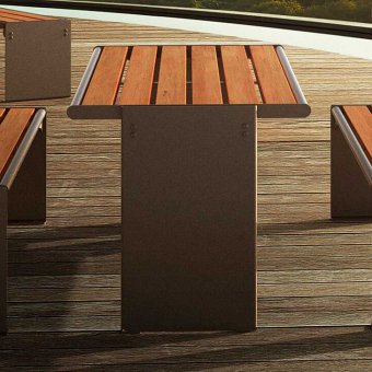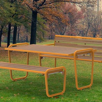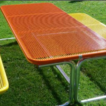 La combinazione panca-tavolo in piano compatto ha un piano del tavolo estremamente robusto. Le panche di questa combinazione possono essere scelte sia in rete metallica che nei diversi tipi di legno.