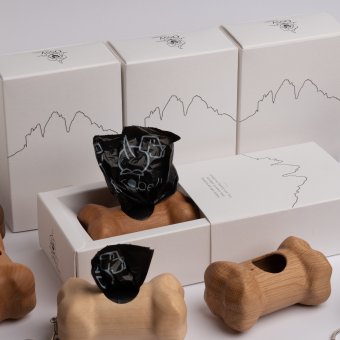 Ai proprietari di cani offriamo anche sacchetti per la raccolta di feci canine di qualità in un pratico formato a rotolo con un elegante dispenser in legno altoatesino.